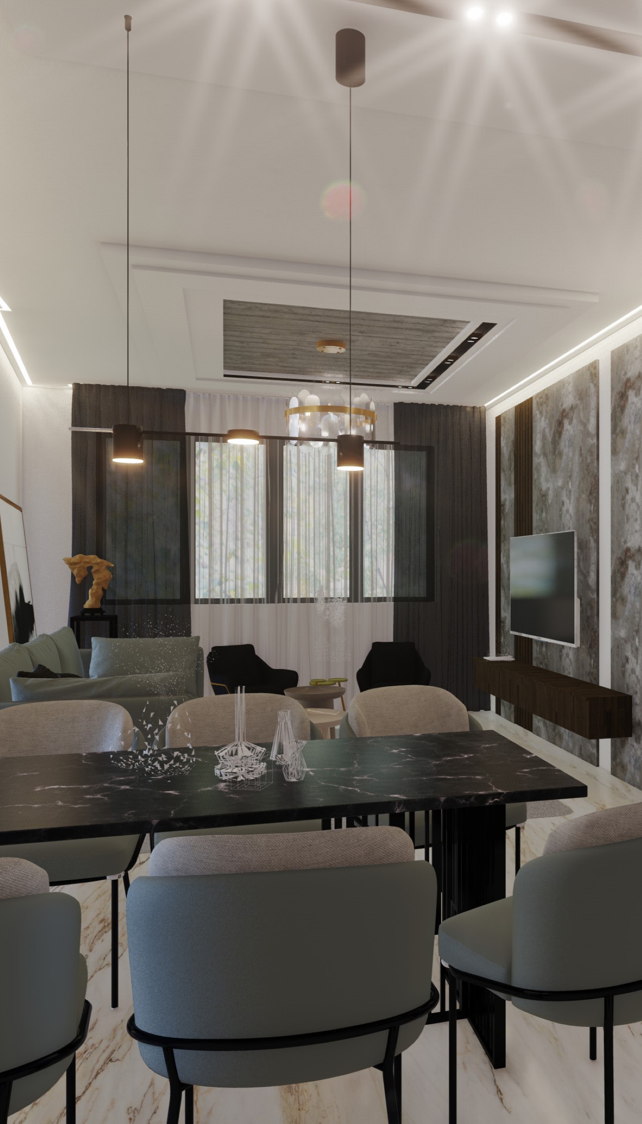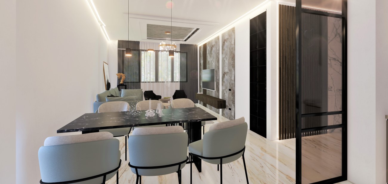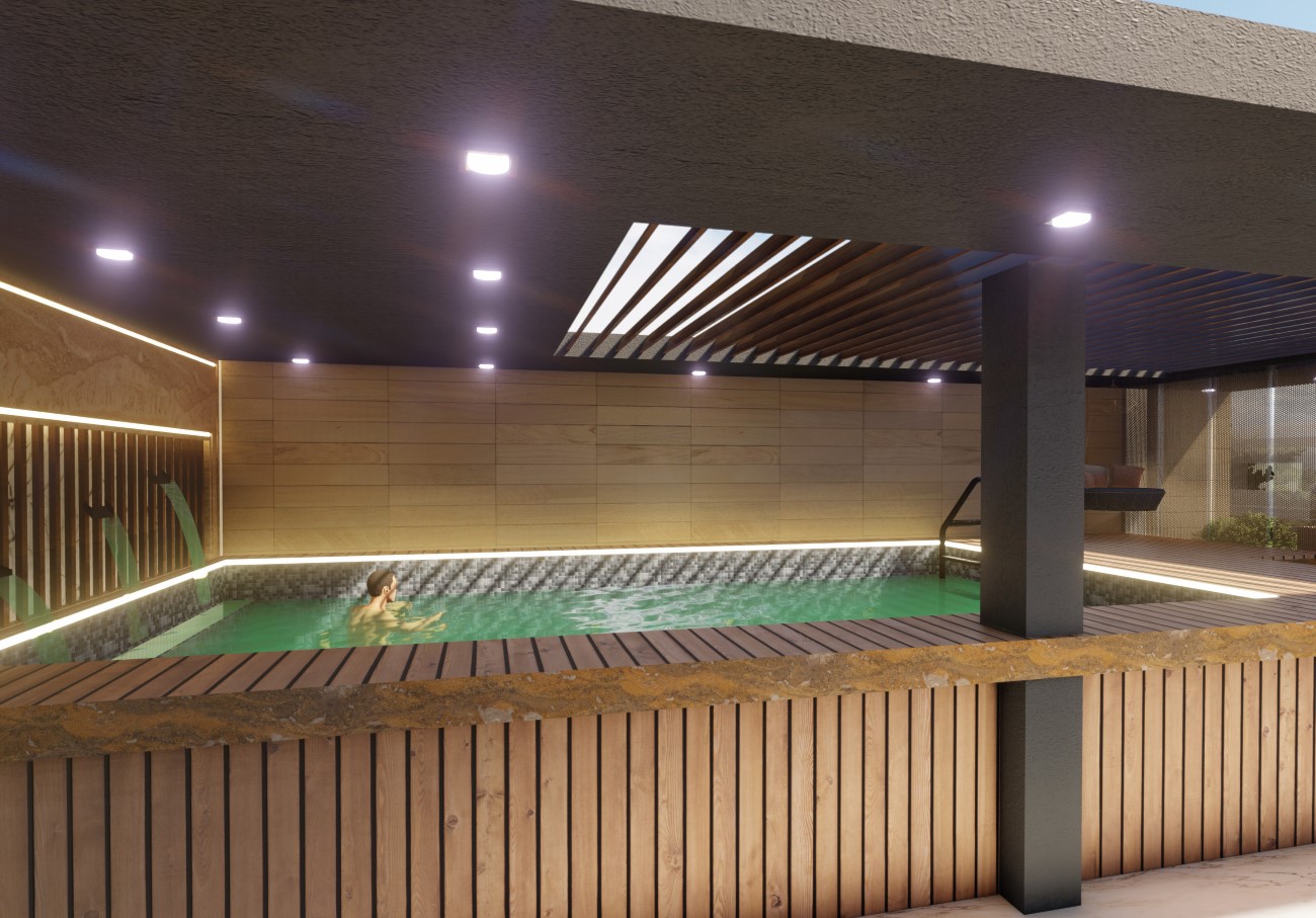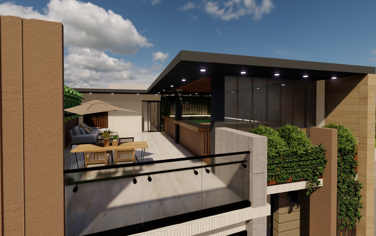 La résidence se développe sur un terrain de 42Zx8m² de surface, de deux façades des deux cotés, nord et sud, une de 9m² de Long et L’autre de13m². Le traitement d’enveloppe se caractérise par son